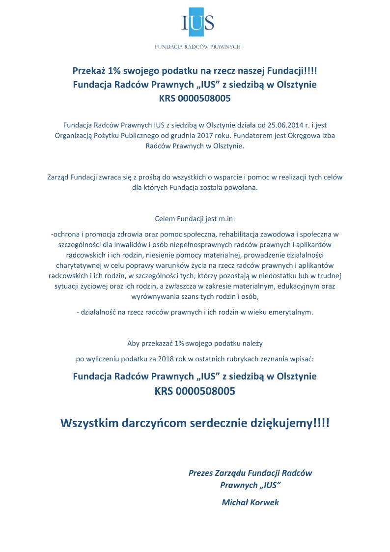 Przekaż 1% dla Fundacji Radców Prawnych „IUS”